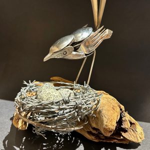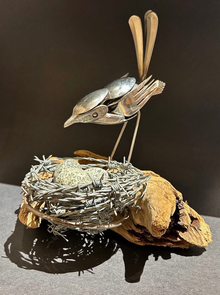 10" l x 8 1/2" w x 10 3/4" h | Salvaged Cutlery, Driftwood, Barb-wire and Stone | $390